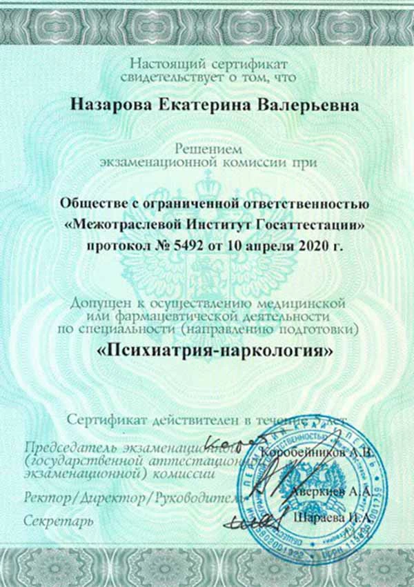 • 2020 г. — Повышение квалификации: Межотраслевой Институт Госаттестации (психиатрия, психиатрия-наркология);